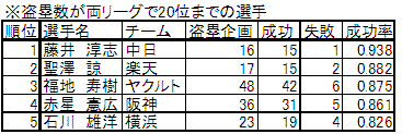 両リーグ盗塁数トップ20位の中で、石川選手の盗塁成功率は5位と、かなり高い数値であることに気がつきました。
